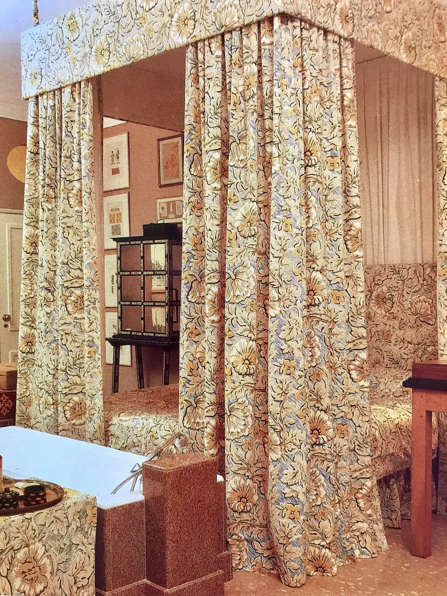 Madame Ghani’s suite, comprising a bathroom, bedroom, and boudoir that ran the length of Villa Verde, seems fairytale of apricot cotton. The tester bed is lined with that fabric; the walls of the suite are entirely hung with it, pleated; and recesses to conceal hanging storage are curtained in the same material.